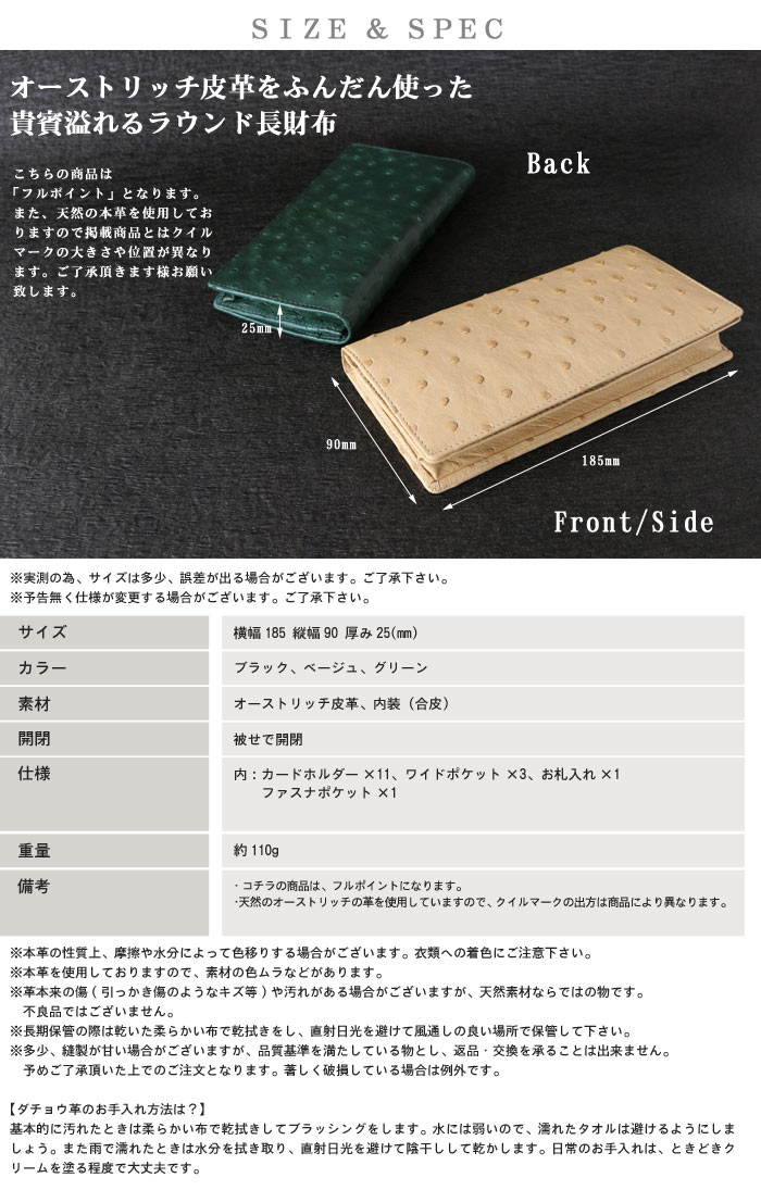一度は、持ってみたい憧れの本物素材!また、ダチョウの革は軽いし丈夫で長持ちな為、さいふにはとても相性が◎!オーストリッチの特徴であるクィルマークは、だちょうの全体の40%しか取れない貴重な部位を使用しているため、クロコダイル(ワニ革)と同等の高級素材と言われています!絶対にお勧めの本革オーストリッチ財布をぜひ手にとってください! ■サイズ:横幅185 縦幅90 厚み25(mm) ■カラー:ブラック、ベージュ、グリーン ■素材:オーストリッチ皮革、内装(合皮) ■仕様内装:カードホルダー×11、ワイドポケット×3、お札入れ×1、ファスナポケット×1 ■開閉:被せで開閉 ■重量:約110g程度 【備考】 こちらの商品は、フルポイントになります 天然のオーストリッチの革を使用していますので、クイルマークの出方は商品により異なります (お急ぎの場合はご確認下さい) ※北海道、九州、沖縄、離島に関しては別途送料が必要となります。