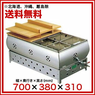 ●外寸:700×380×H310、鍋:600×360×95●容量:19L●材質:18-8ステンレス、木●ガス消費量(kw/h):4.82●8ツ仕切●ガス接続口:ゴム管3分口(φ9.5)